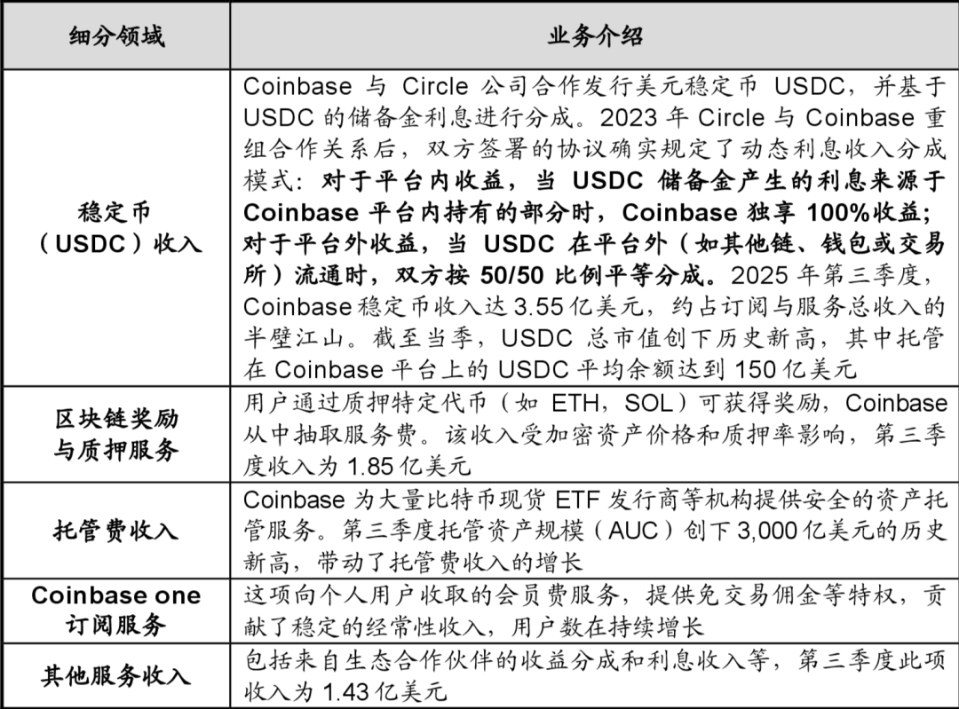 订阅与服务业务。包括稳定币USDC收入、质押服务、托管费等,2025年第三季度收入达7.47亿美元,有效平抑市场波动带来的收入波动。Coinbase与Circle公司合作发行USDC,从其利息收入中分成,成为稳定的利润来源。对于平台内收益,当USDC储备金产生的利息来源于Coinbase平台内持有的部分时,Coinbase独享100%收益;对于平台外收益,当USDC在平台外(如其他链、钱包或交易所)流通时,双方按50/50比例平等分成。