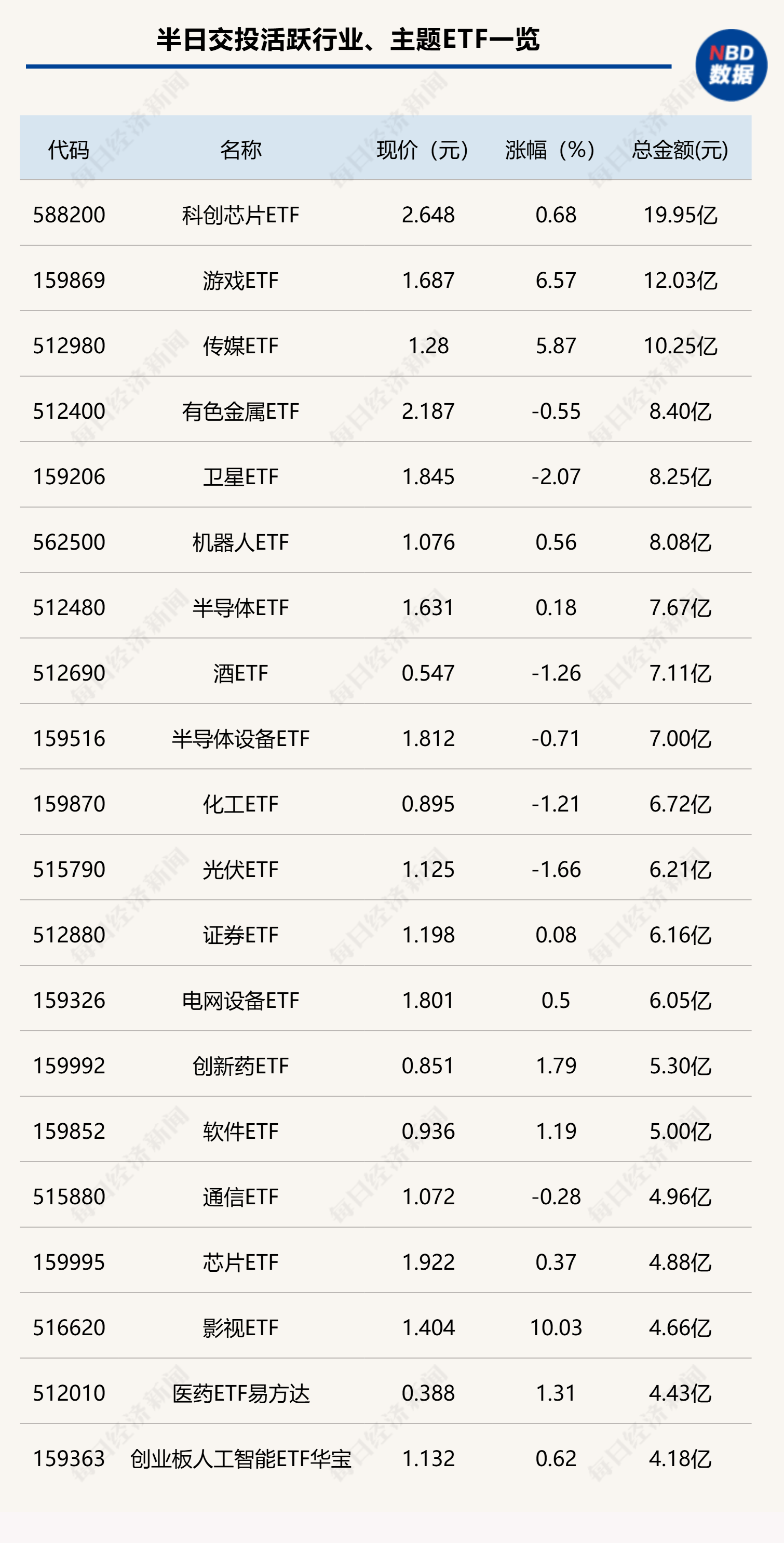 ETF涨幅榜方面,两只影视ETF双双涨停,价格均创历史新高,游戏与传媒相关ETF同样大幅上涨,半日涨幅在5%左右,涨幅领先。