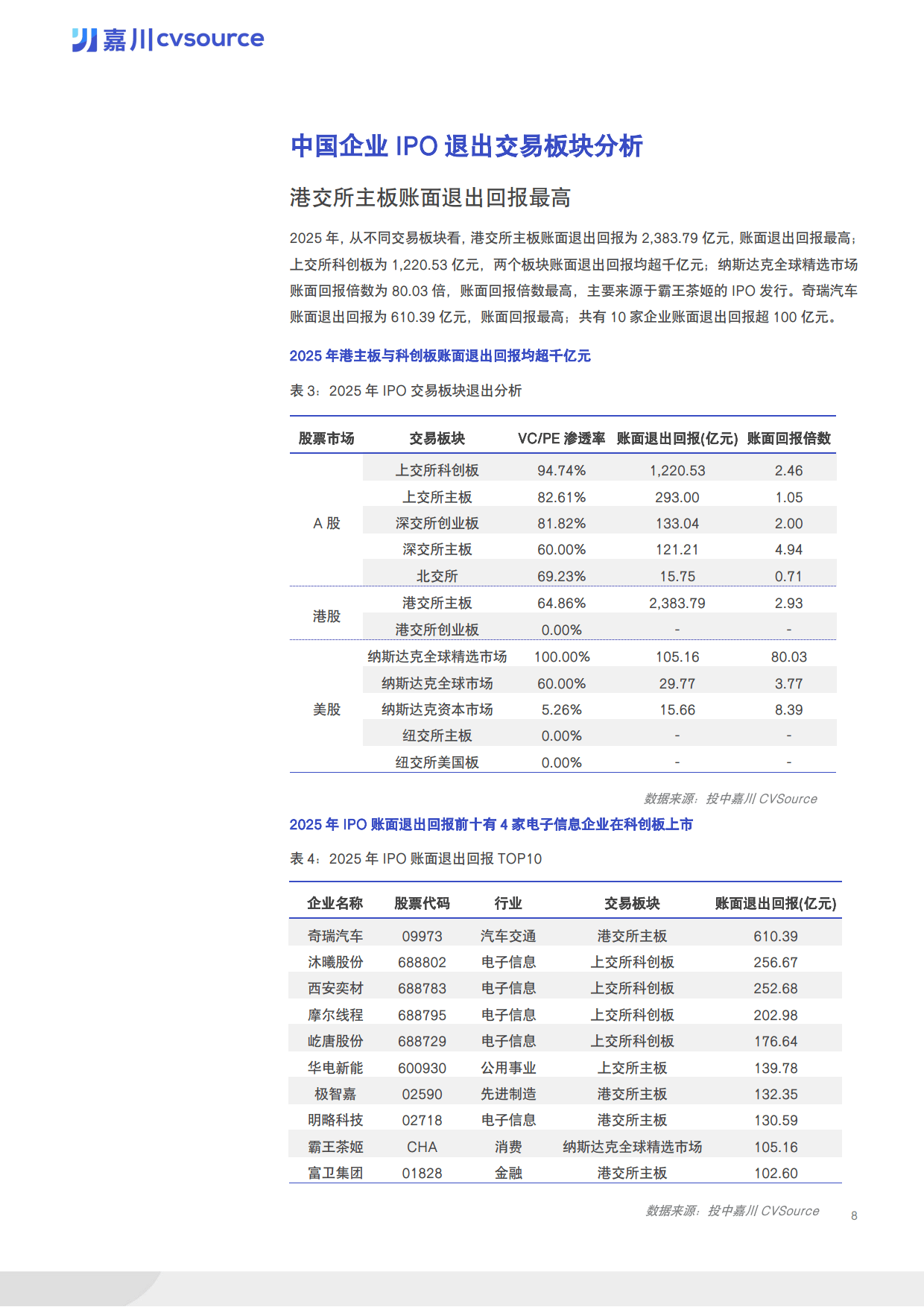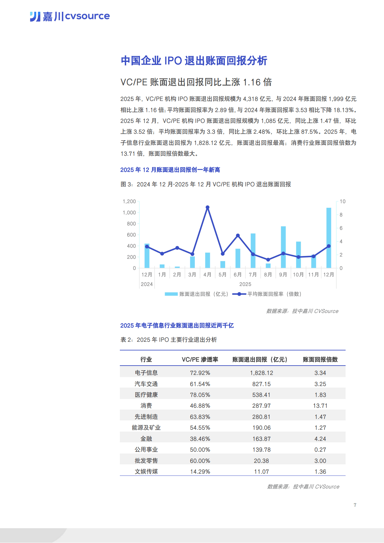 VC/PE 机构参与度持续深化,全年 170 家具有 VC/PE 背景的中企实现上市,渗透率达 57.82%,12 月渗透率更是升至 80% 创年内新高。红杉中国以参投 16 家企业的战绩位居榜首,深创投集团、中金资本均参投 15 家企业紧随其后。机构账面退出回报达 4318 亿元,同比上涨 1.16 倍,电子信息行业以 1828.12 亿元账面退出回报居首,消费行业则以 13.71 倍的回报倍数领跑。