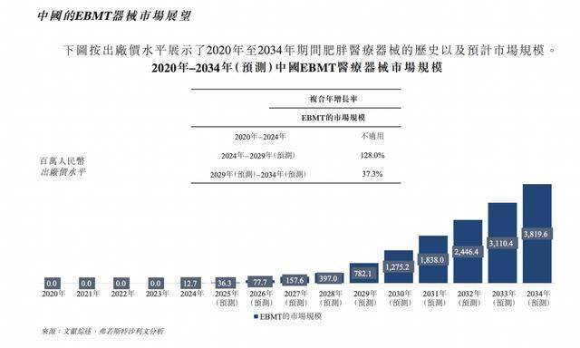 在中国,EBMT范围内的超重╱肥胖医疗器械市场正从零基础起步,进入快速扩张阶段。按出厂价计算,市场规模预计将于2024年以人民币12.7百万元起步,到2029年扩大至人民币782.1百万元,2024年至2029年的复合年增长率将高达128.0%,主要得益于肥胖疾病负担持续加重、临床应用范围逐步拓宽、产品审批提速,以及医保报销条件持续完善,叠加EBMT产品上市并实现临床推广应用。
