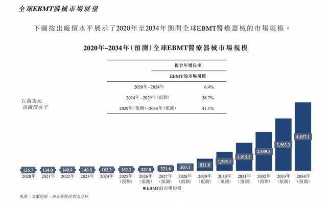 全球EBMT医疗器械市场(出厂价水平)从2020年的126.7百万美元增长至2024年的162.3百万美元,同期复合年增长率达6.4%。到2029年,市场规模预计将扩大至约831.8百万美元,2024年至2029年以38.7%的复合年增长率增长;至2034年进一步增长至约4,657.1百万美元,2029年至2034年间以41.1%的复合年增长率增长。
