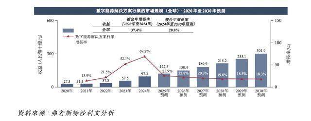 随着能源管理重要性日益提升,全球数字能源解决方案行业持续保持快速增长。于2020年至2024年,按收益计,全球数字能源解决方案行业的市场规模由273亿元增长至973亿元,复合年增长率为37.4%。