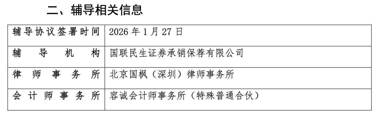 本次IPO的辅导机构为国联民生证券承销保荐有限公司,律师事务所为北京国枫(深圳)律师事务所,会计师事务所为容诚会计师事务所(特殊普通合伙) 。
