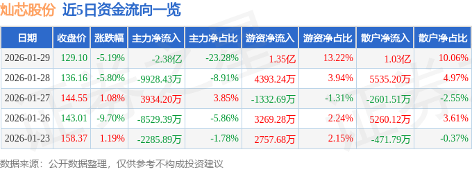 证券之星消息,截至2026年1月29日收盘,灿芯股份(688691)报收于129.1元,下跌5.19%,换手率10.87%,成交量7.77万手,成交额10.23亿元。