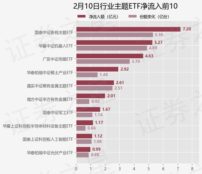 当日有68只行业主题ETF基金出现资金净流入,其中净流入排首位的是国泰中证影视主题ETF(516620),份额增加了5.3亿份,净流入额为7.2亿元。