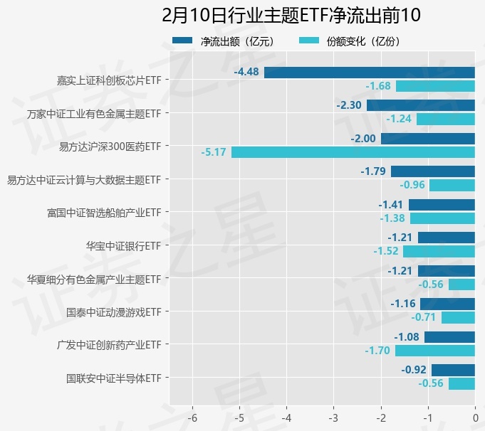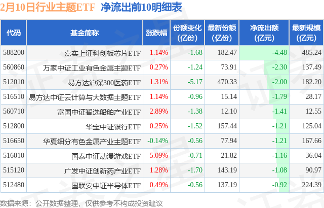 当日有170只行业主题ETF基金出现资金净流出,其中净流出排首位的是嘉实上证科创板芯片ETF(588200),份额减少了1.68亿份,净流出额为4.48亿元。