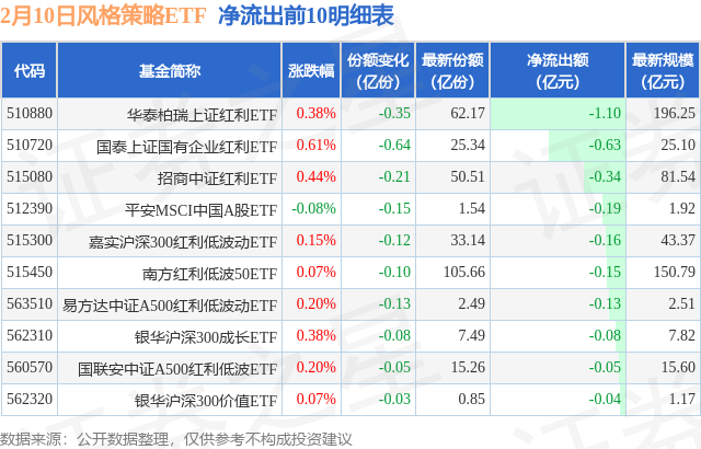 当日有15只风格策略ETF基金出现资金净流出,其中净流出排首位的是华泰柏瑞上证红利ETF(510880),份额减少了3500.0万份,净流出额为1.1亿元。