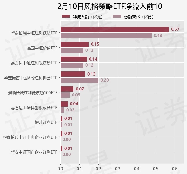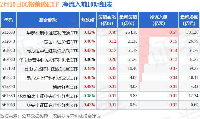 当日有9只风格策略ETF基金出现资金净流入,其中净流入排首位的是华泰柏瑞中证红利低波ETF(512890),份额增加了4800.0万份,净流入额为5684.17万元。