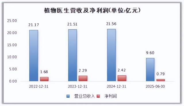 2022年至2024年,植物医生营业收入分别为21.17亿元、21.51亿元、21.56亿元,营收增速从2023年的1.61%骤降至2024年的0.23%,几乎陷入停滞。净利润虽从1.68亿元增至2.42亿元,但2025年上半年仅实现7901.78万元,同比下滑压力显现。