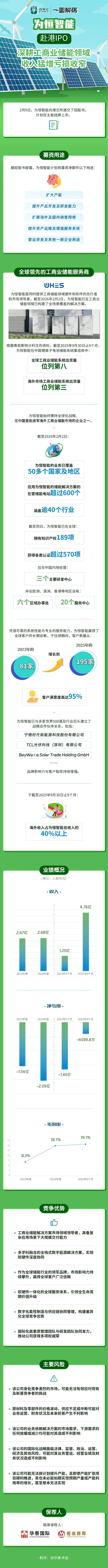 为恒智能是同时提供工商储能领域硬件和软件的先行者和市场领导者。截至2026年2月2日,为恒智能已在工商业储能领域已构建了全场景覆盖的解决方案。根据弗若斯特沙利文的资料,截至2025年9月30日止9个月,为恒智能在中国锂离子电池储能系统集成商中,全球工商业储能系统出货量位列第八及海外市场工商业储能系统出货量位列第三。