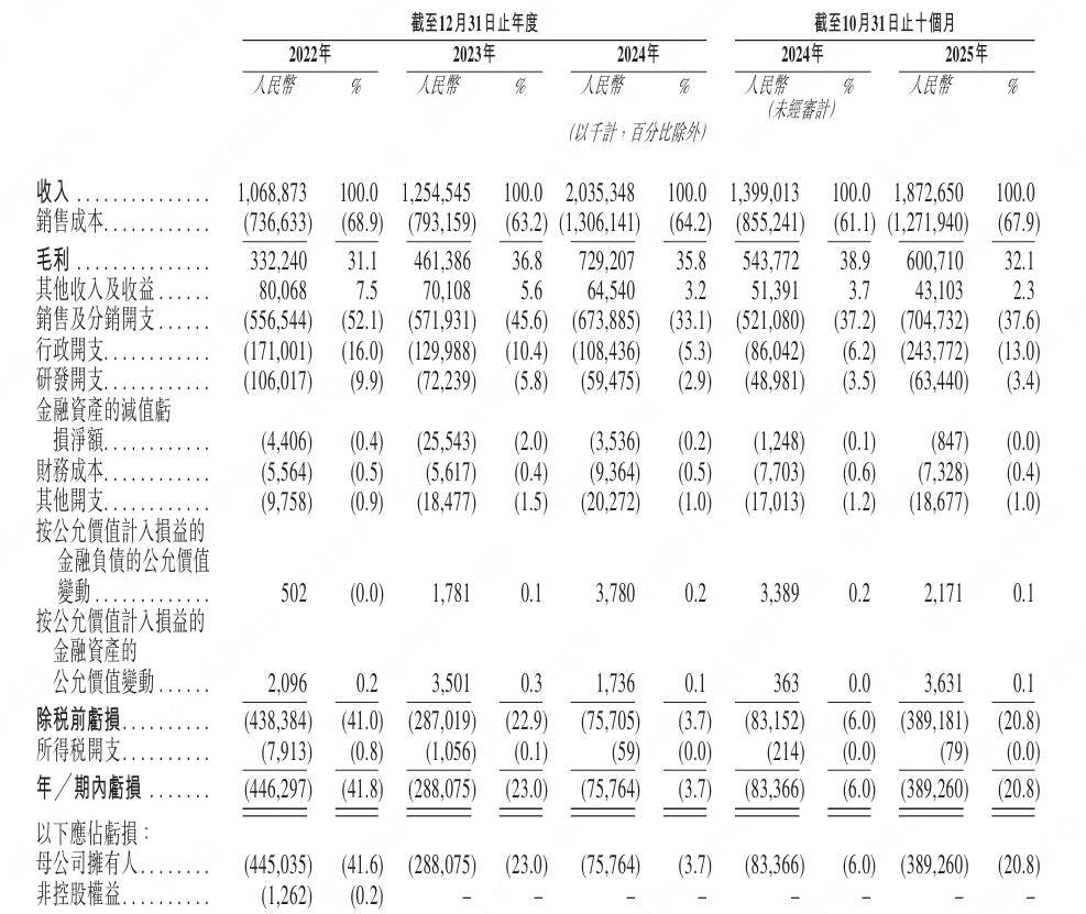 但与之对应的,是亏损的扩大与尴尬的盈利表现。2022年至2024年,净亏损分别为4.46亿元、2.88亿元、0.76亿元,2025年前10个月又新增亏损3.89亿元,累计亏损约12亿元。