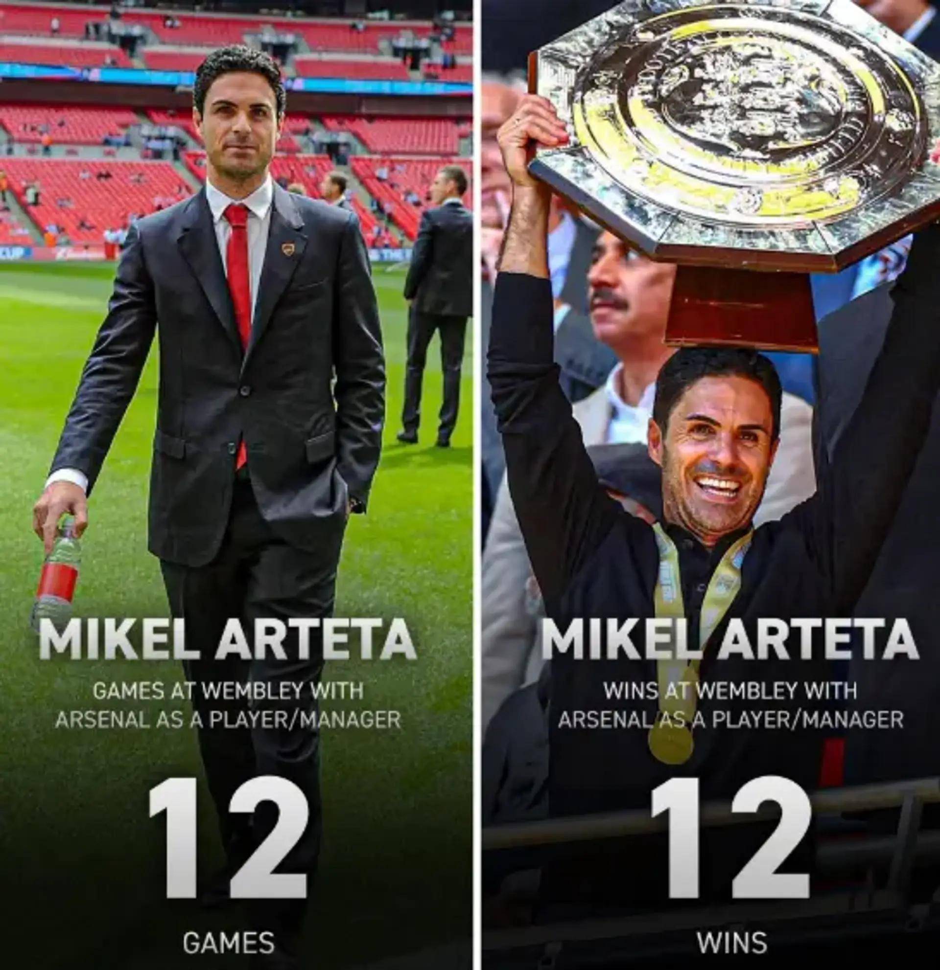 从球员时代到教练时代,阿尔特塔在这座国家体育场完成了12 次亮相,保持全胜金身。