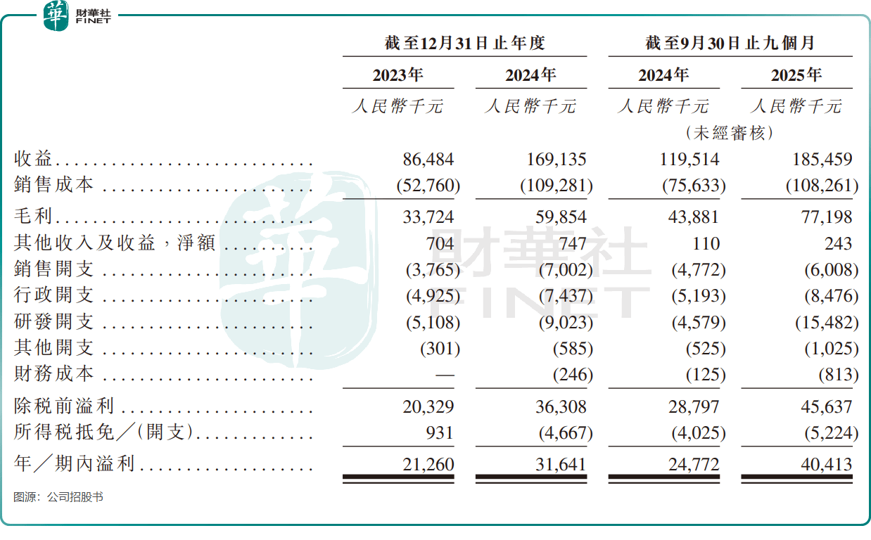 2023年至2024年,公司收入从8648.4万元增长至1.69亿元,接近翻倍;年內溢利从2126万元增至3164.1万元。2025年前三季,收入进一步增至1.85亿元,期内溢利达4041.3万元,展现出强劲的增长势头。