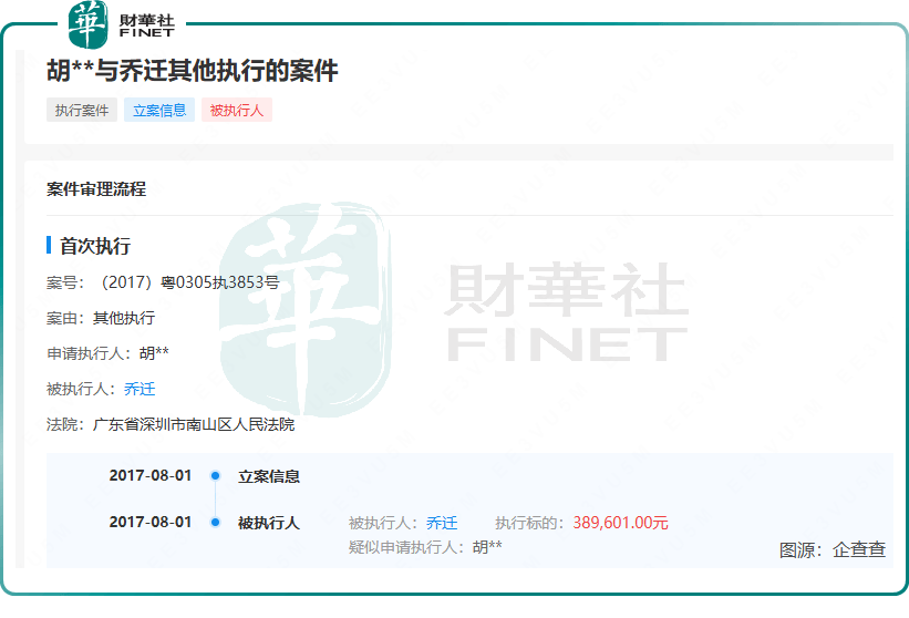 不过,乔迁光鲜履历的背后亦有争议,企查查资料显示,乔迁曾于2017年两度成为被执行人:1月因婚姻家庭纠纷案件被执行,标的9.605万元;8月又因其他执行案件被深圳市南山区人民法院列为被执行人,执行标的38.96万元。尽管该等案件已过去多年,但历史司法记录仍可能成为市场审视公司治理合规性的关注点。