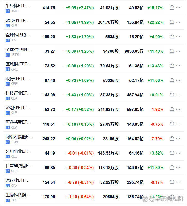 半导体ETF涨2.47%,能源业ETF涨1.99%,全球科技股指数ETF涨1.7%,在美股盘初领跑行业ETF,医疗业ETF则跌0.51%。