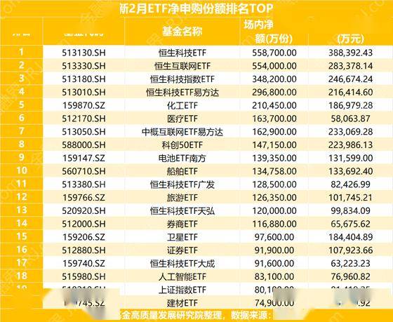 尽管港股科技板块近期出现调整,资金却呈现逆势流入态势。截至2月9日,2月以来净申购份额居前的20只基金中,有8只为港股科技类ETF,合计净申购规模超过160亿元。其中,华泰柏瑞恒生科技ETF、华夏恒生互联网科技业ETF等产品月内获净申购均超过55亿份,易方达恒生科技ETF也获净申购近30亿份。除科技赛道外,化工、医疗、电池等行业ETF同样获得资金关注。