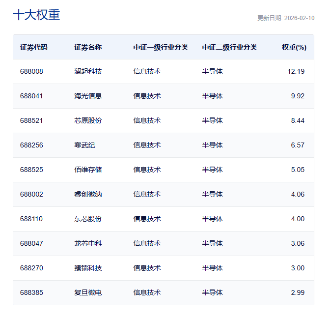 注:数据显示,该指数重点覆盖了澜起科技(内存接口)、海光信息(国产算力)、佰维存储(存储器)、睿创微纳(模拟芯片)、臻镭科技(模拟芯片)等细分领域龙头。高集中度的持仓结构,使其能够直观反映存储涨价、AI算力爆发与模拟芯片复苏带来的产业红利。图片来源:中证指数官网