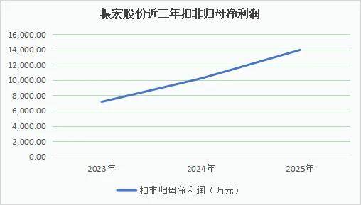 盈利方面公司振宏股份更加亮眼,利润增速持续超越营收增速。2023至2025年,公司扣非归母净利润分别为7,147.39万元、10,205.74万元和13,941.11万元,可比上期分别增长23.04%、42.79%和36.60%。