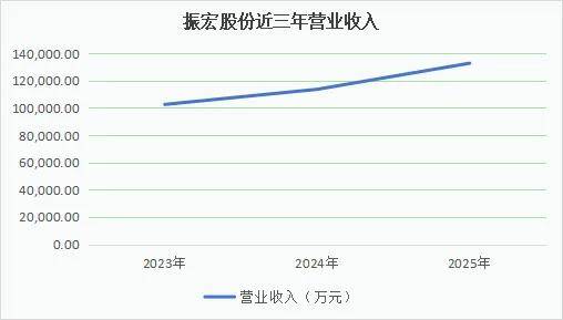 凭借优质的客户资源、领先的技术实力和多元化的业务布局,振宏股份近年来业绩持续快速增长。招股书数据表明,2023年至2025年,公司营业收入分别为102,518.82万元、113,612.42万元和132,714.24万元,可比上期分别增长10.82%、28.10%和16.81%。