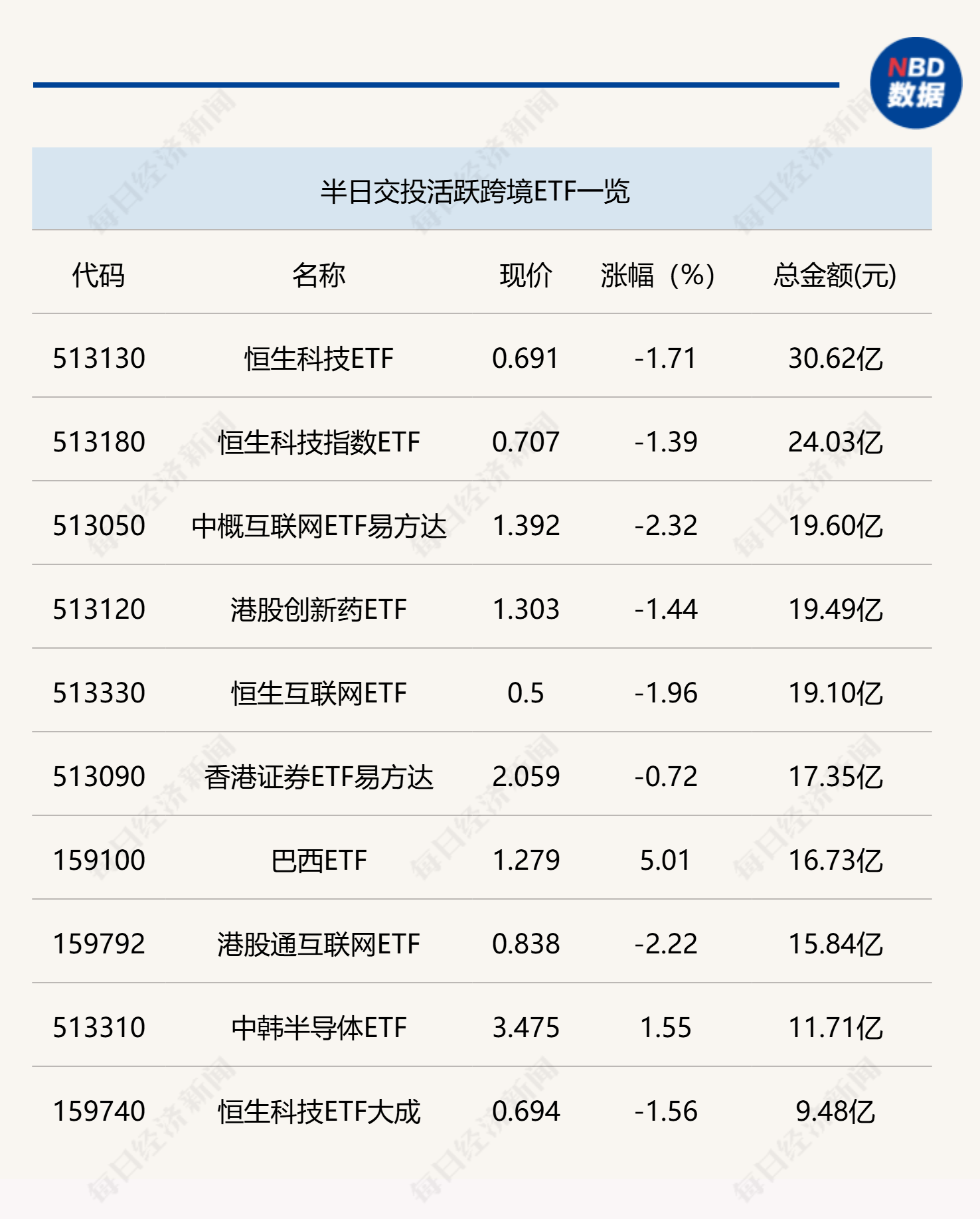 今日上午,行业、主题ETF交投迎来大幅减少,科创芯片ETF(588200)半日成交金额仅为13.92亿元,电网设备ETF(159326)半日成交金额则放量到10亿元,其余行业类ETF半日成交金额均未超过10亿元;跨境ETF方面,交投同样清淡,仅恒生科技ETF(513130)半日成交金额超过30亿元。