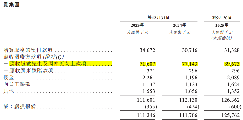 招股书显示,截至2025年9月30日,公司“预付款项、按金及其他应收款项”中,应收赵敏先生及周仲英女士(实控人赵敏及其配偶)款项高达8967万元;应收广东微临296万元,合计8997万元。
