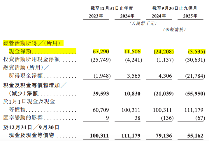 招股书显示,2023年公司经营活动所得现金净额为6729万元,而2024年则骤降至1151万元。2025年前9个月,公司的经营活动所用现金净额为-353.5万元。同时,现金及现金等价物从2024年底的1.11亿元大幅下降至2025年9月底的5516万元,降幅达50.3%。
