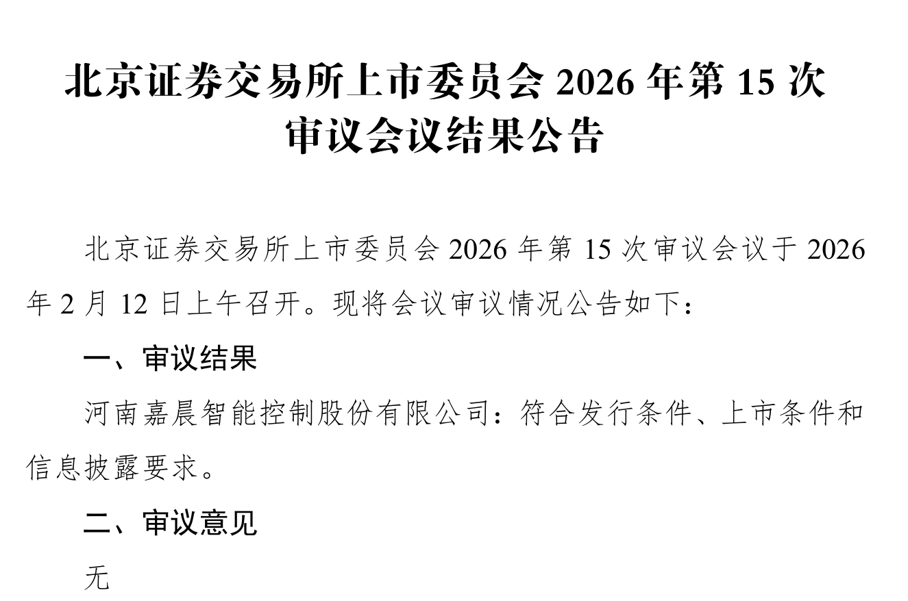 上证报中国证券网讯 2月12日盘后,嘉晨智能发布北京证券交易所上市委员会2026年第15次审议会议结果公告。结果显示,河南嘉晨智能控制股份有限公司(首发)符合发行条件、上市条件和信息披露要求。
