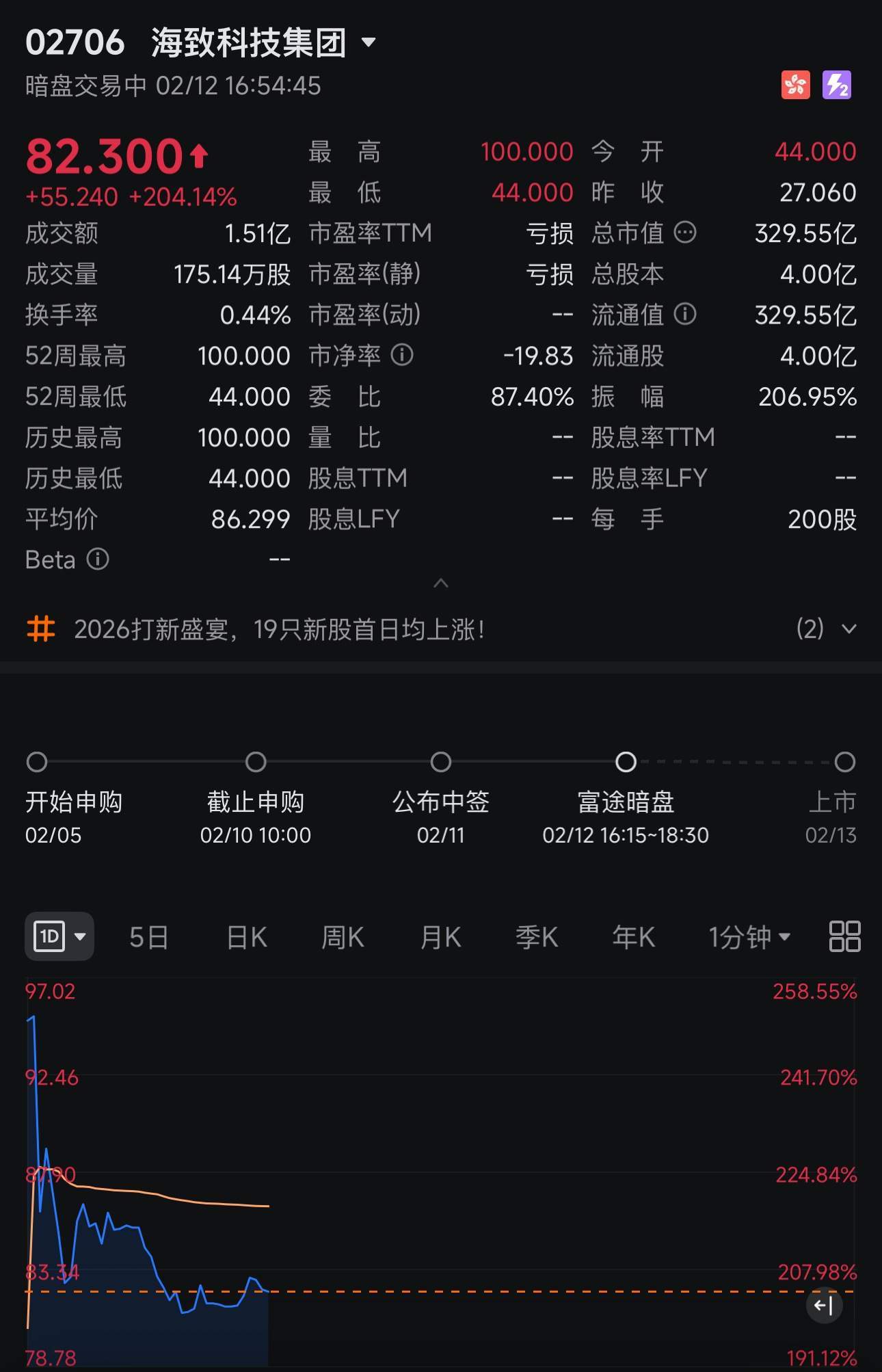 “AI除幻第一股”海致科技集团(02706)将于2月13日(星期五)在香港挂牌。截至发稿,富途证券暗盘交易显示报价82.3港元,较招股价27.06港元上涨204.14%%,每手200股,不计手续费,每手赚11048港元