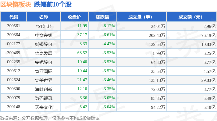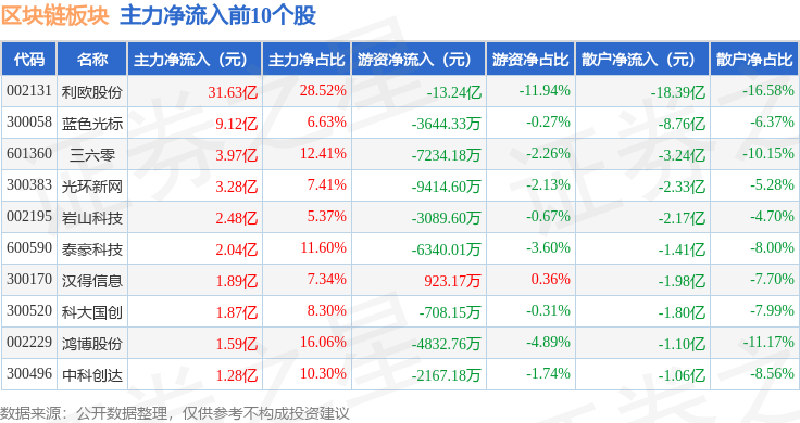 从资金流向上来看,当日区块链板块主力资金净流入27.34亿元,游资资金净流出20.7亿元,散户资金净流出6.64亿元。区块链板块个股资金流向见下表: