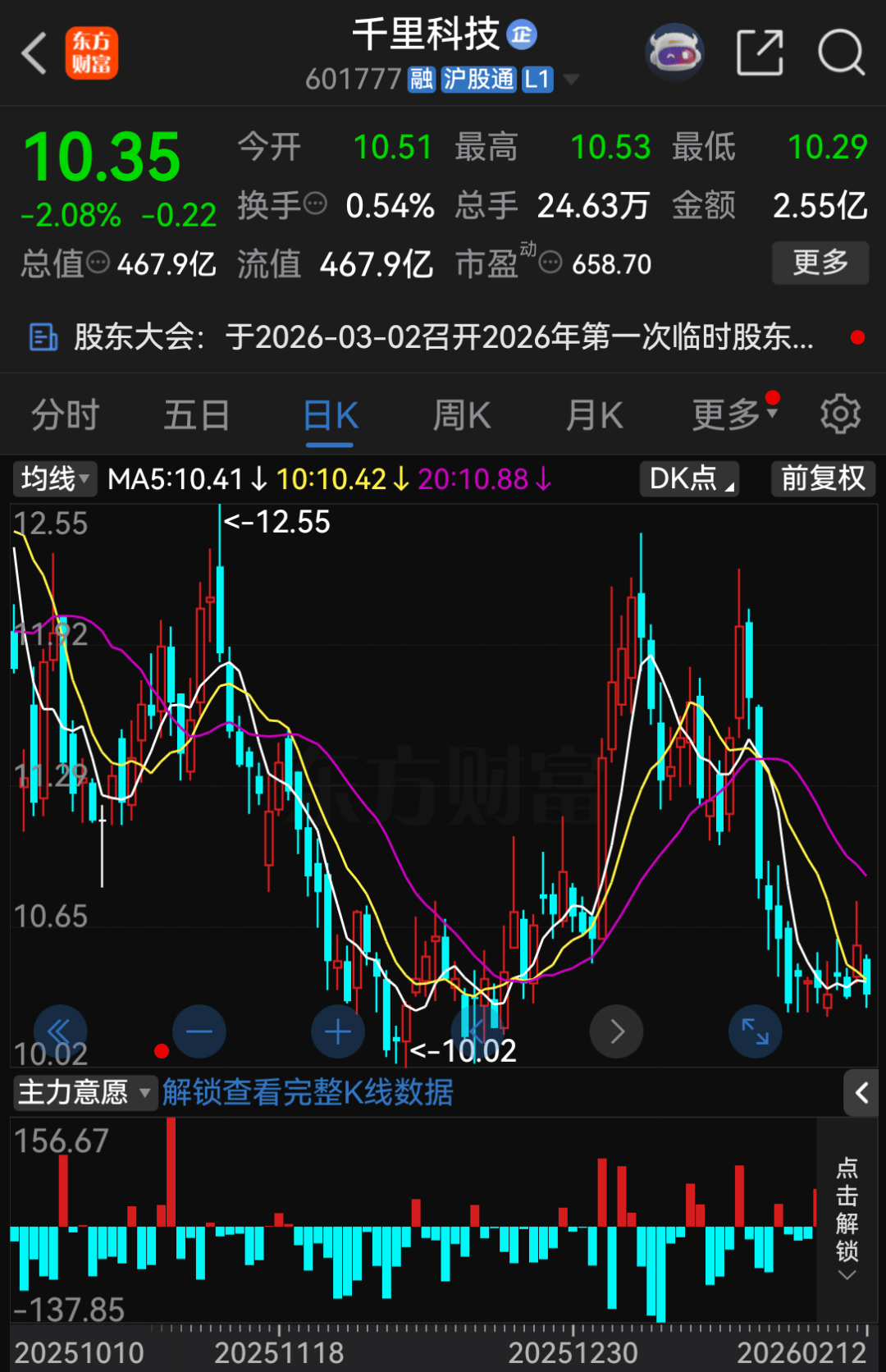 2月12日收盘,千里科技A股股价报10.35元/股,跌2.08%,总市值为467.9亿元。