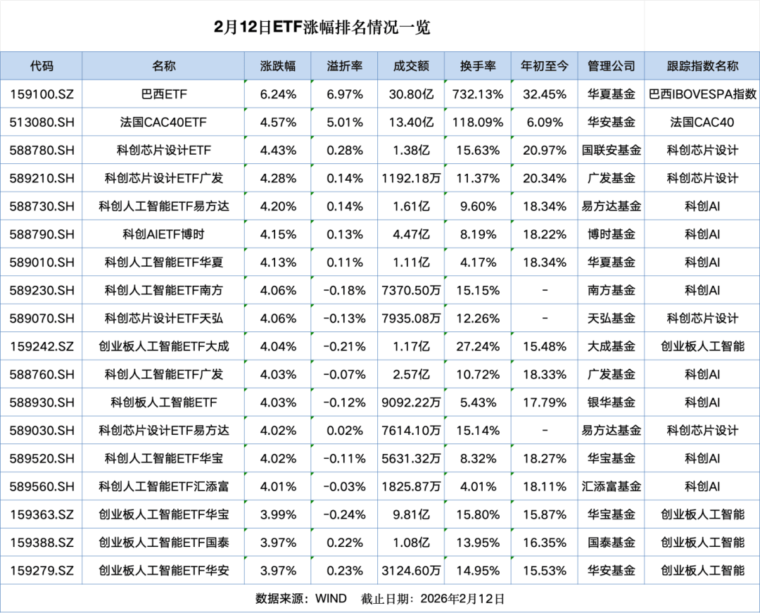 ETF方面,当日全市场共有873只产品上涨,跨境ETF涨幅居前,巴西ETF大涨6.24%,法国CAC40ETF涨4.57%。多只科创人工智能ETF“霸榜”。
