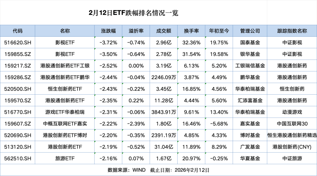 跌幅方面,有521只ETF下跌,多只影视ETF、港股通创新药ETF、旅游ETF跌幅居前。