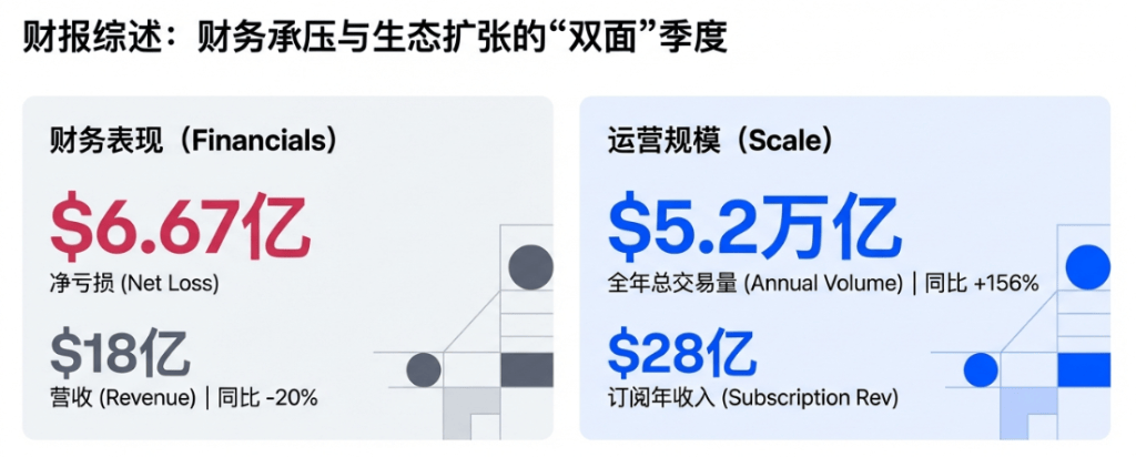 全年总交易量达5.2万亿美元(同比+156%),加密交易量市占率升至6.4%(同比翻倍)。更被管理层视作“穿越周期压舱石”的订阅与服务收入创历史新高至28亿美元,USDC相关收益与会员订阅成为关键支点