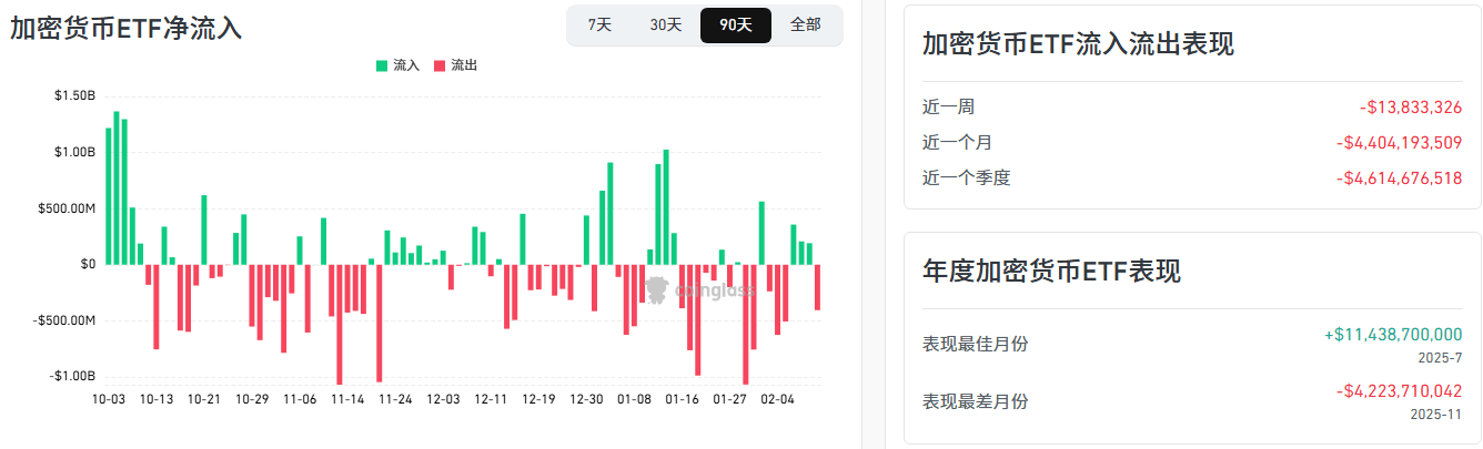 这点,我们从数据上也能看到,过去三个月美国上市的加密货币ETF累计净流出接近40亿美元,ETF资金流出直接压制比特币价格,形成“价格跌—资金流出—价格续跌”的恶性循环,散户参与度同步下滑,接盘力量薄弱。
