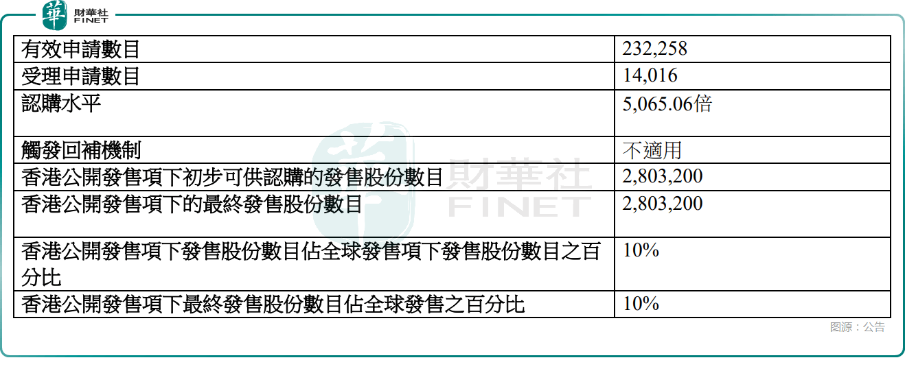 从日前招股阶段的表现来看,香港公开发售方面,海致科技集团获5065.06倍认购,公开发售的发售股份最终数目为280.32万股,占发售股份总数的约10%。合计获得约23.23万份有效申请,受理申请数目约14016份,一手中签率仅0.06%。