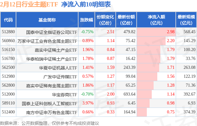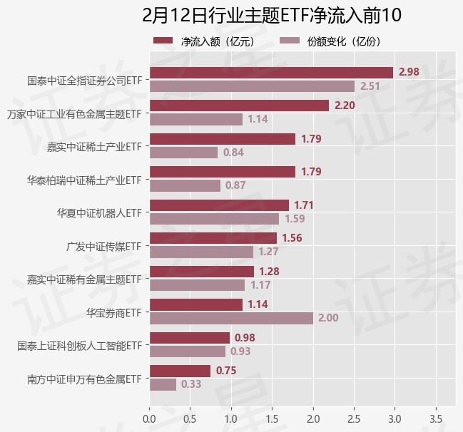 当日有68只行业主题ETF基金出现资金净流入,其中净流入排首位的是国泰中证全指证券公司ETF(512880),份额增加了2.51亿份,净流入额为2.98亿元。