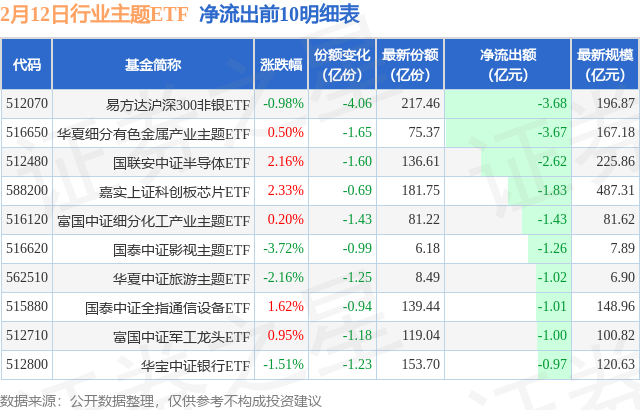 当日有171只行业主题ETF基金出现资金净流出,其中净流出排首位的是易方达沪深300非银ETF(512070),份额减少了4.06亿份,净流出额为3.68亿元。