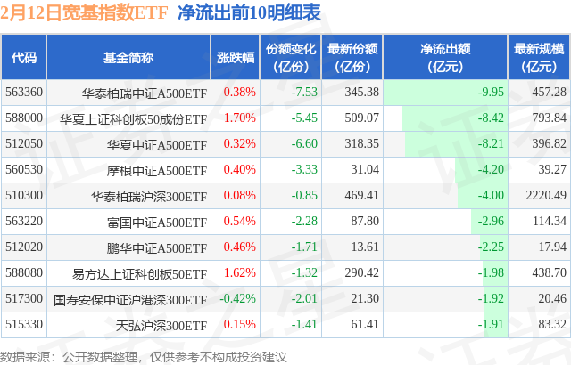 当日有70只宽基指数ETF基金出现资金净流出,其中净流出排首位的是华泰柏瑞中证A500ETF(563360),份额减少了7.53亿份,净流出额为9.95亿元。