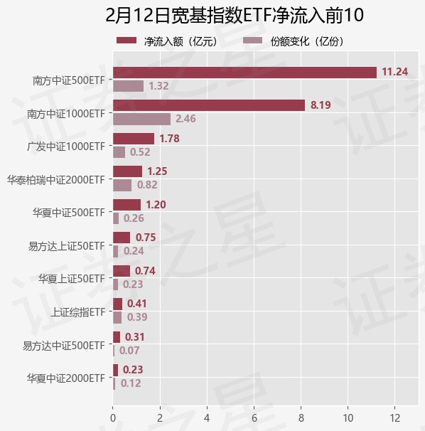 当日有31只宽基指数ETF基金出现资金净流入,其中净流入排首位的是南方中证500ETF(510500),份额增加了1.32亿份,净流入额为11.24亿元。
