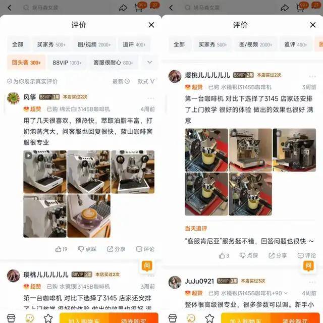 销量表现更突出的则是“G3145B双瞳家商两用半自动现磨咖啡机(定温打奶)”售价4499元/台,销量超9000台。有消费者评价:“预热快,油脂丰富,蒸汽足,客服回复快。”另有买家表示:“店家还安排了上门教学,做出来的效果很满意。”