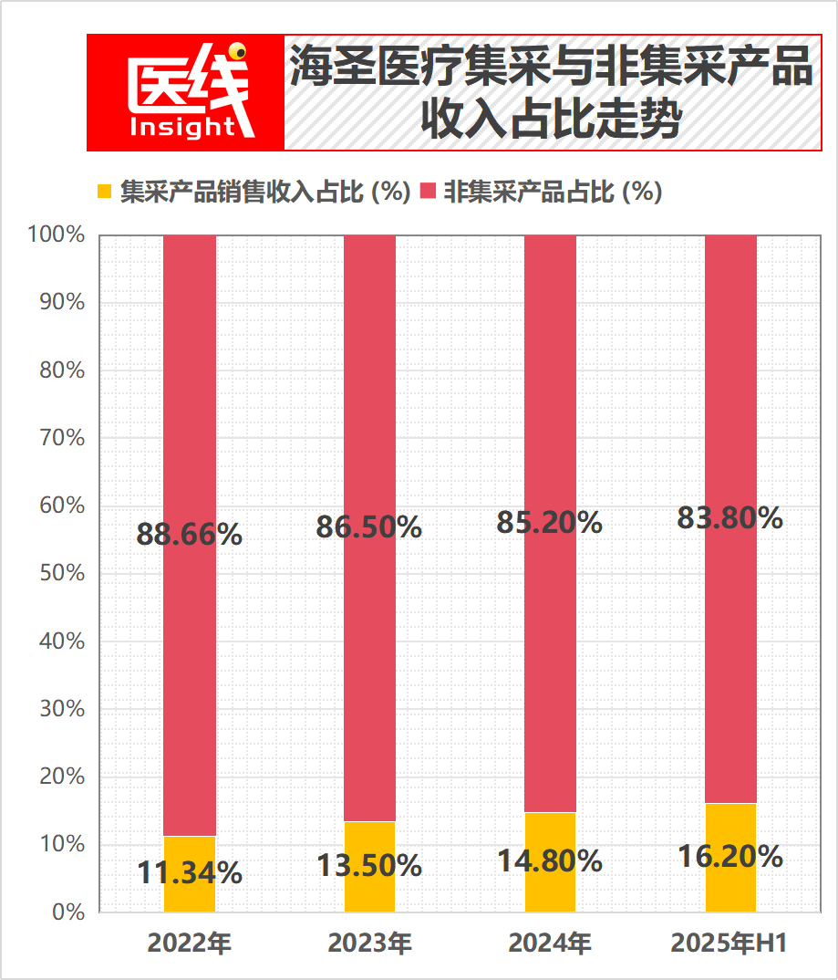 报告期内,海圣医疗集中带量采购产品的销售收入占比呈上升趋势:从2022年的11.34%逐步提升至2025年上半年的16.20%。