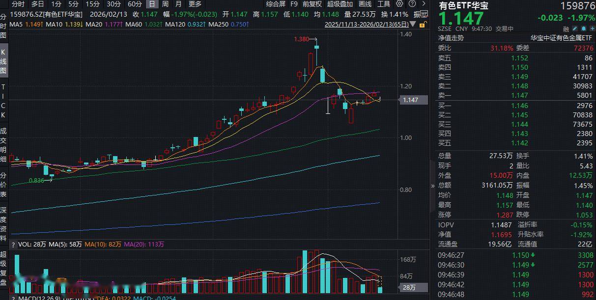 或受相关扰动,今日(2月13日)揽尽有色金属行业龙头的有色ETF(159876)场内价格一度跌超2.4%,现跌1.97%,跌破5日线,下方仍有10日线支撑,技术面或显示为,短线走弱,但趋势还没坏,属于正常回踩、洗盘形态