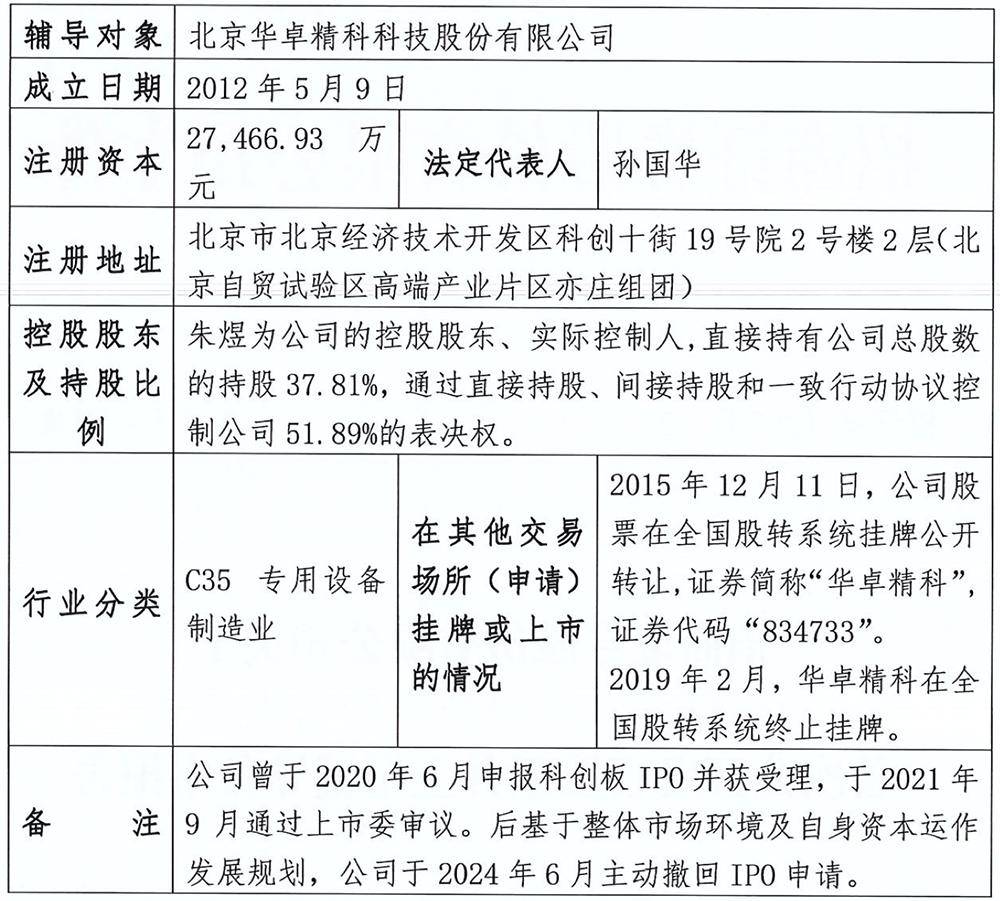 华卓精科于2015年12月在新三板挂牌,2019年2月终止挂牌,曾于2020年6月申报科创板IPO并获受理,2021年通过上市委审议,后基于整体市场环境及自身资本运作发展规划,在2024年6月主动撤回IPO申请。