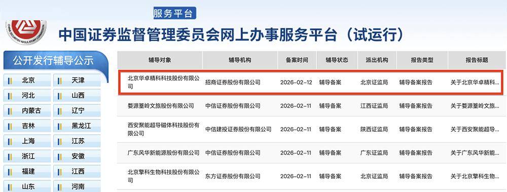 芯东西2月13日报道,2月12日,证监会官网披露,北京半导体设备企业华卓精科在北京证监局办理上市辅导备案登记,启动A股IPO进程,辅导机构是招商证券。