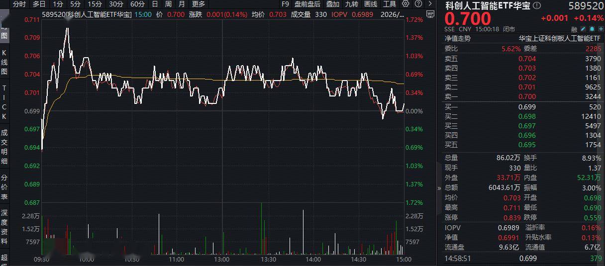 无惧美股科技股行情波动,重点布局国产AI产业链的科创人工智能ETF(589520)场内涨幅早盘上探1.72%,后虽被大盘拖累,但仍逆市收涨0.14%,全天成交额6043万元,环比小幅放量。