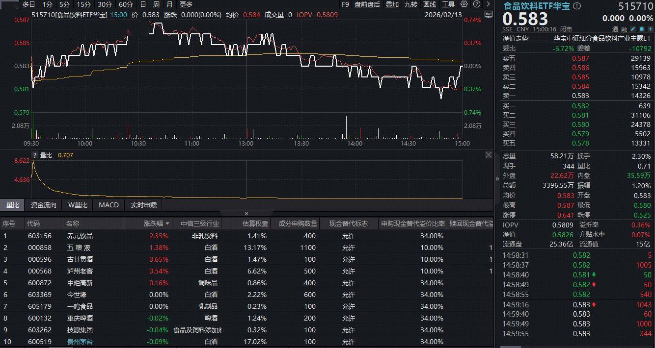 从估值方面来看,吃喝板块估值处于历史低位,当前或为板块较好布局时机。数据显示,截至昨日(2月12日)收盘,食品饮料ETF华宝(515710)标的指数细分食品指数市盈率为20.32倍,位于近10年来8.02%分位点的低位,中长期配置性价比凸显。