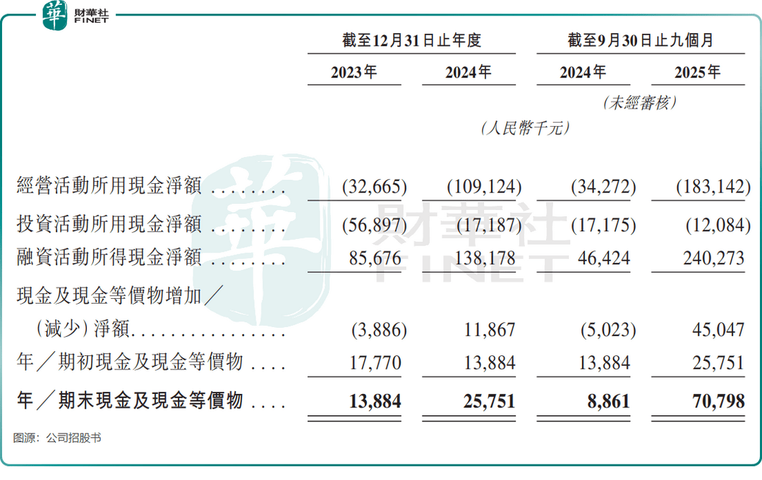 由于处于业务投入期,公司持续产生亏损,2023年净亏损3247.9万元,2024年扩大至6098.6万元,2025年前三季度亏损5866.6万元。经营现金流同样承压,2025年前三季度经营活动所用现金净额达1.83亿元,较上年同期大幅增加。