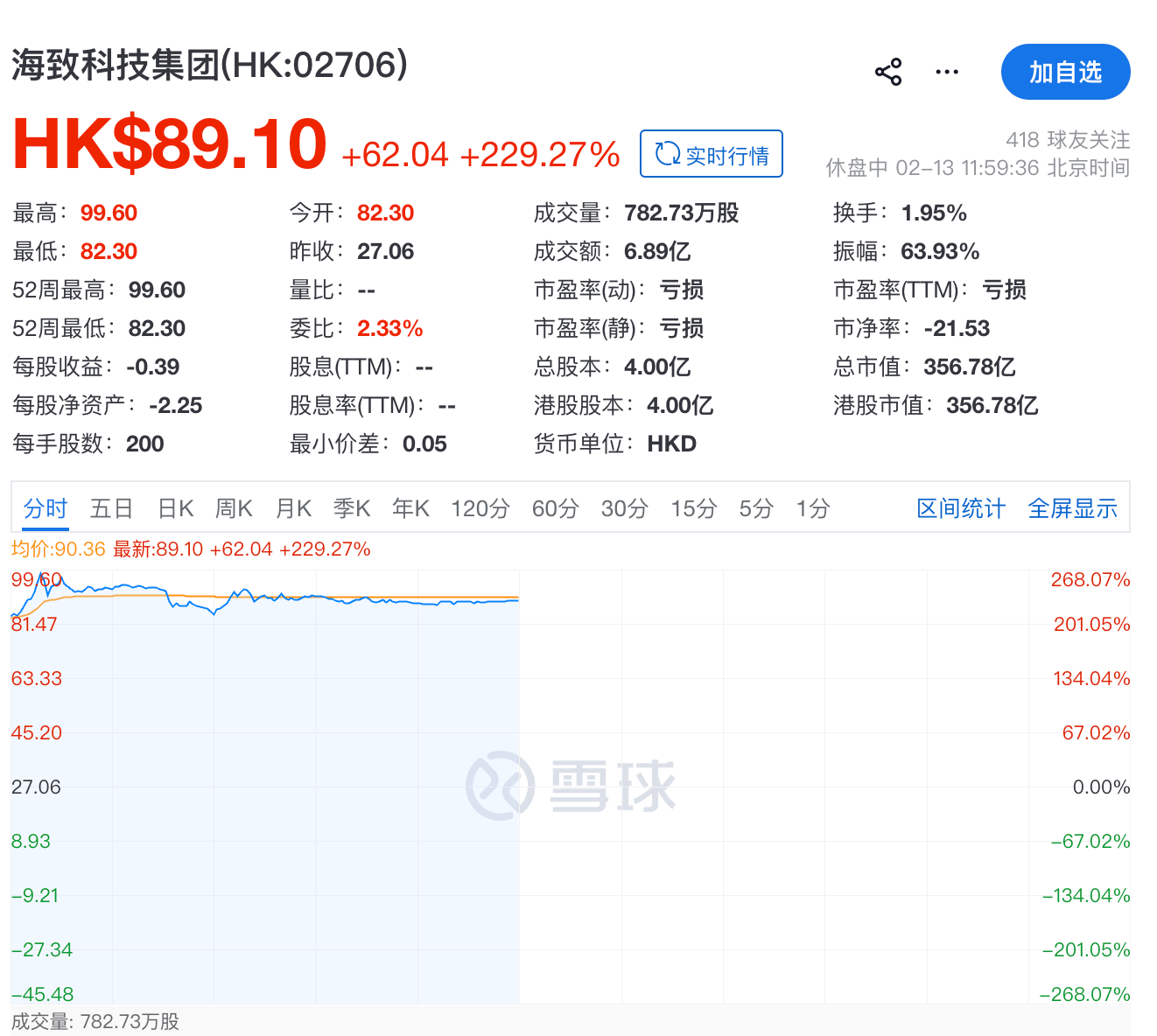 2月13日,北京海致科技集团股份有限公司(简称“海致科技”)在港交所上市。发行价27.06港元,开盘涨204.14%报82.3港元,总市值329.6亿;截至午间收盘,每股涨229.27%至89.1港元,总市值356.78亿。