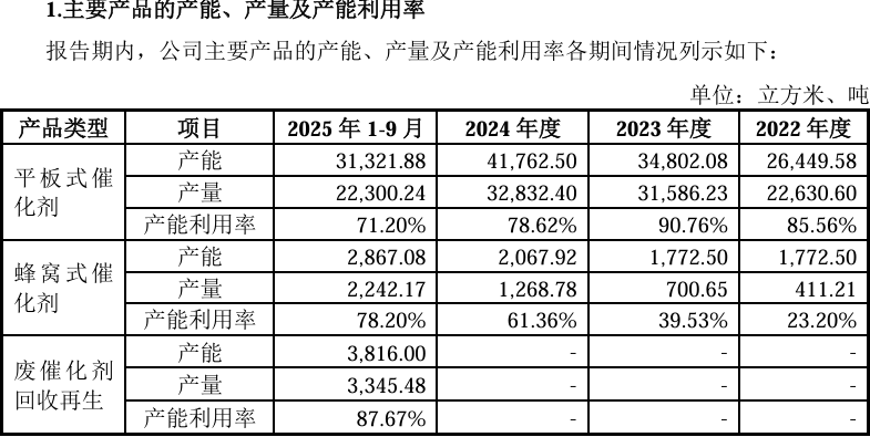 市场增量受限首先体现在产能利用率的下滑上。招股书显示,华电光大平板式催化剂产能利用率近年持续下滑,2022年为85.56%、2023年增至90.76%(峰值)、2024年为78.62%、2025年前三季度再度降至71.20%。