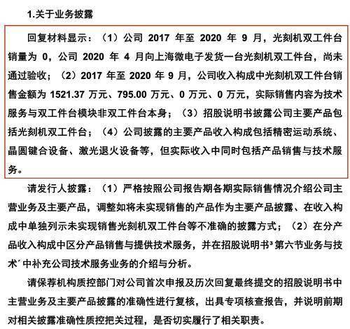 2017年至2020年9月,华卓精科光刻机双工件台实际销量为 0,仅2020年4月向上海微电子发货一台且未通过验收;此期间,该产品账面销售金额实则为技术服务与双工件台模块收入,并非整机销售所得。同时公司招股说明书将光刻机双工件台列为主要产品,且披露的主要产品收入构成中,未区分精密运动系统等品类的产品销售与技术服务收入,存在信息披露与实际经营情况不符的问题。